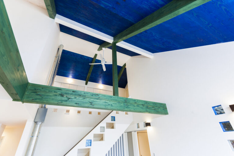 木の香りがするリビングには、檜の無垢材を使用。高く吹き抜けた天井は梁と…