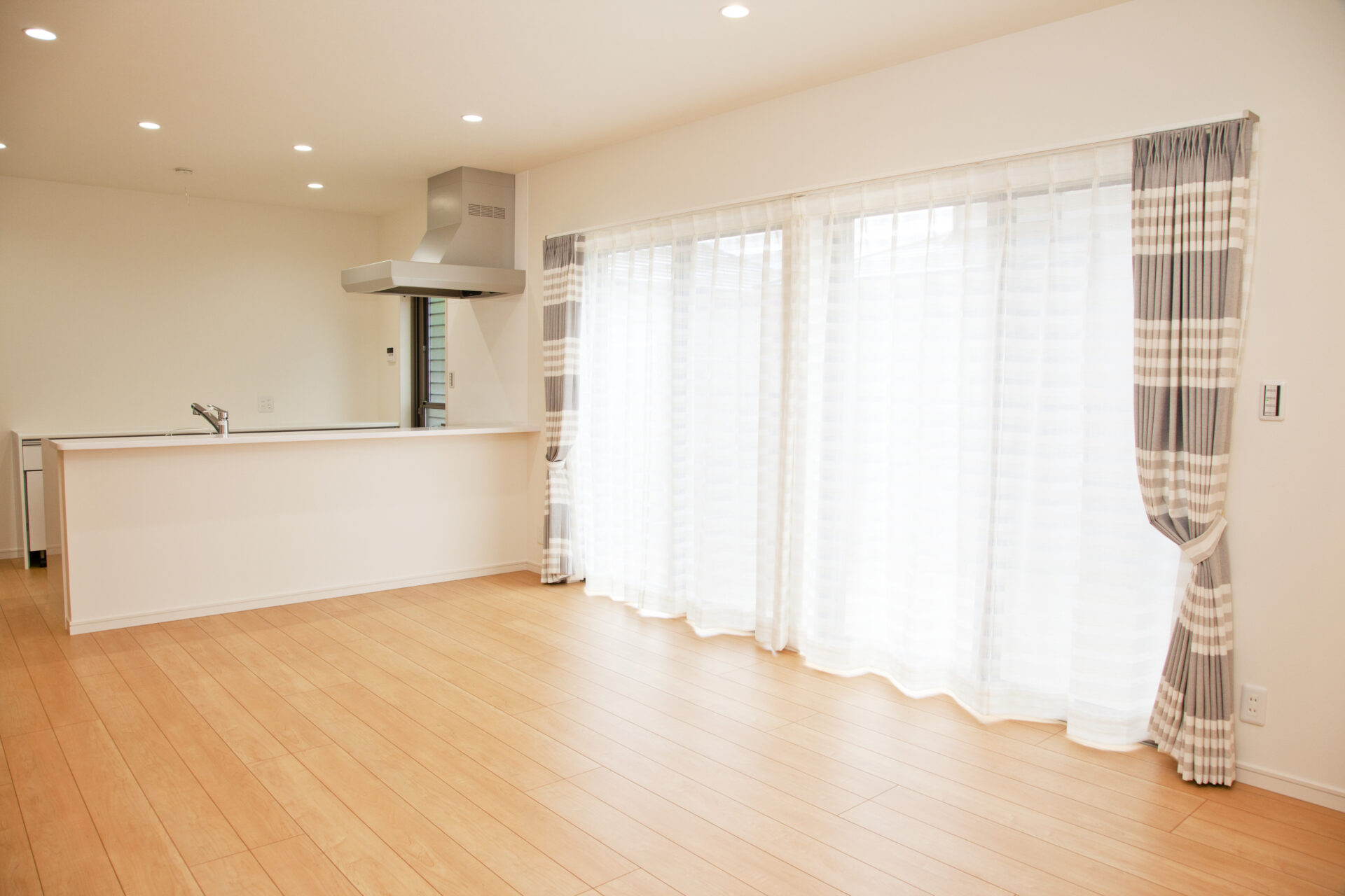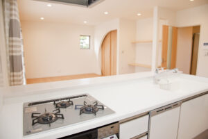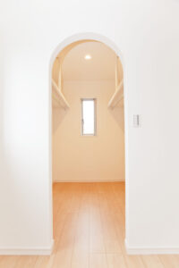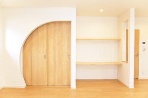 リビングは自然光がいっぱいに取り込めるように大きな窓を取り付け、お子様が一緒に勉強できるスタディースペースも配置。和室とリビングをつなぐ入り口をアーチ型にする事でそれぞれの空間に“和み”を足し算しました。 柄ではなく、カタチで遊ぶ家づくりです。