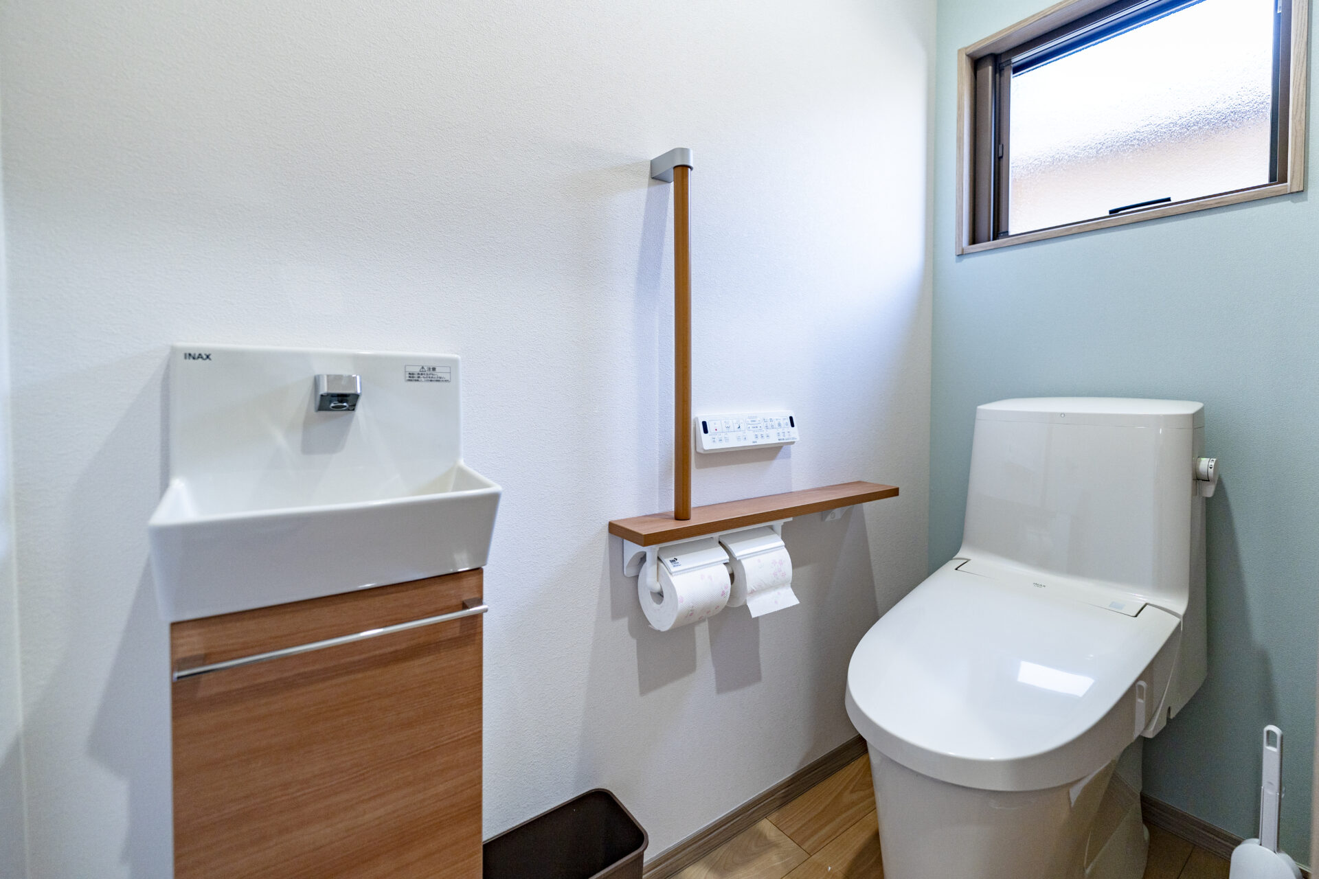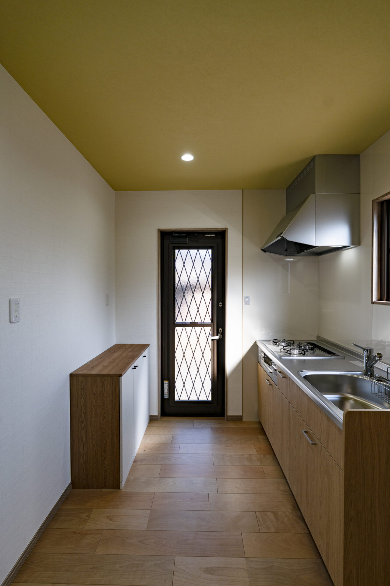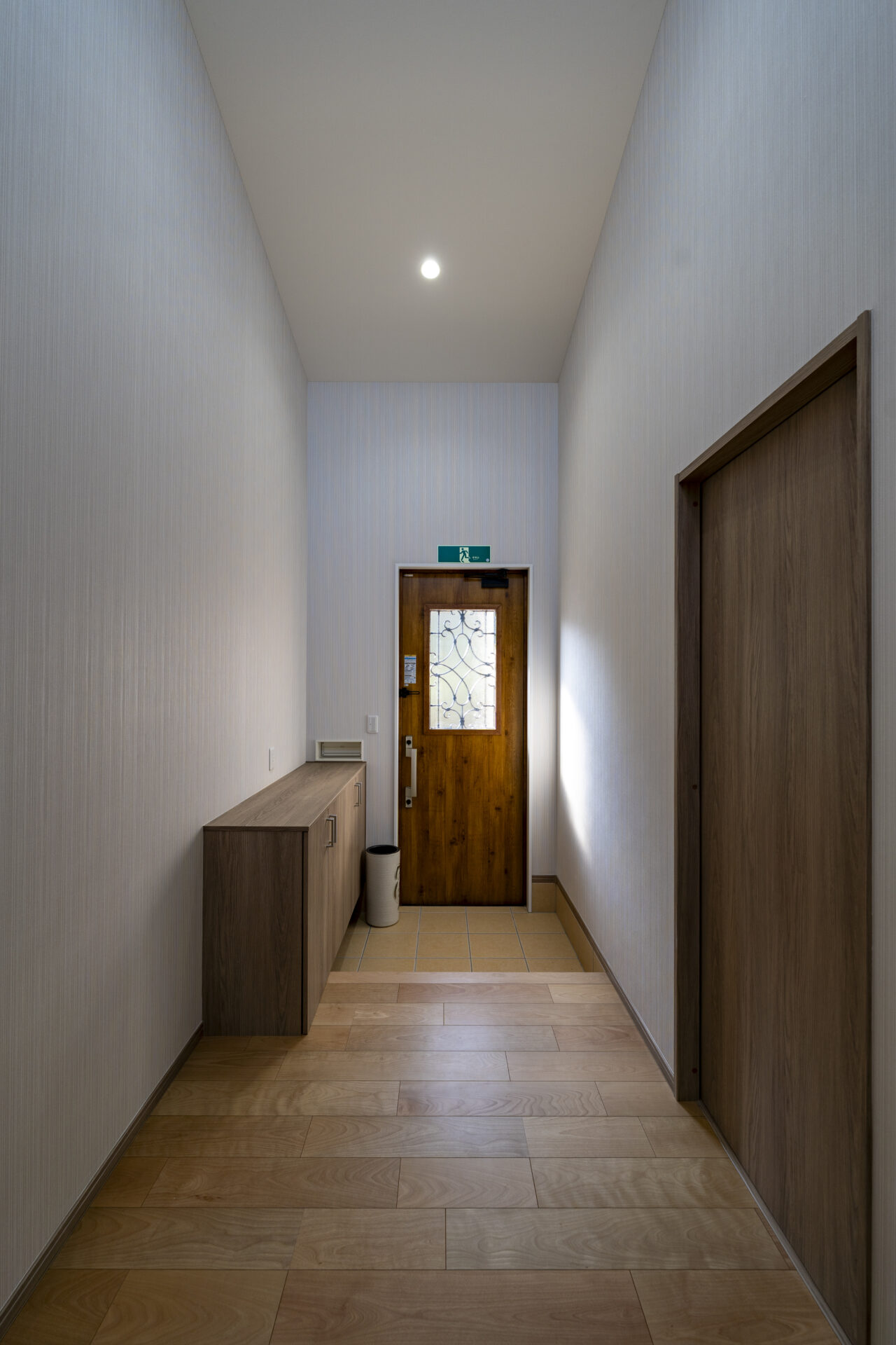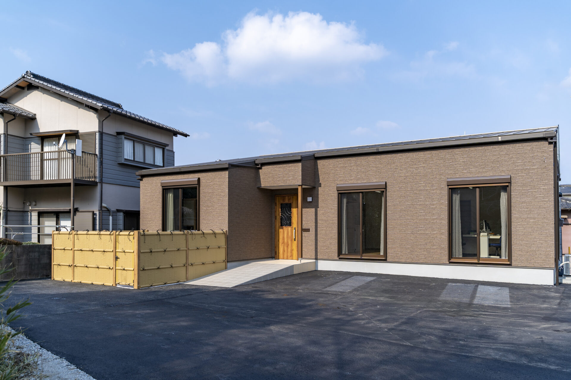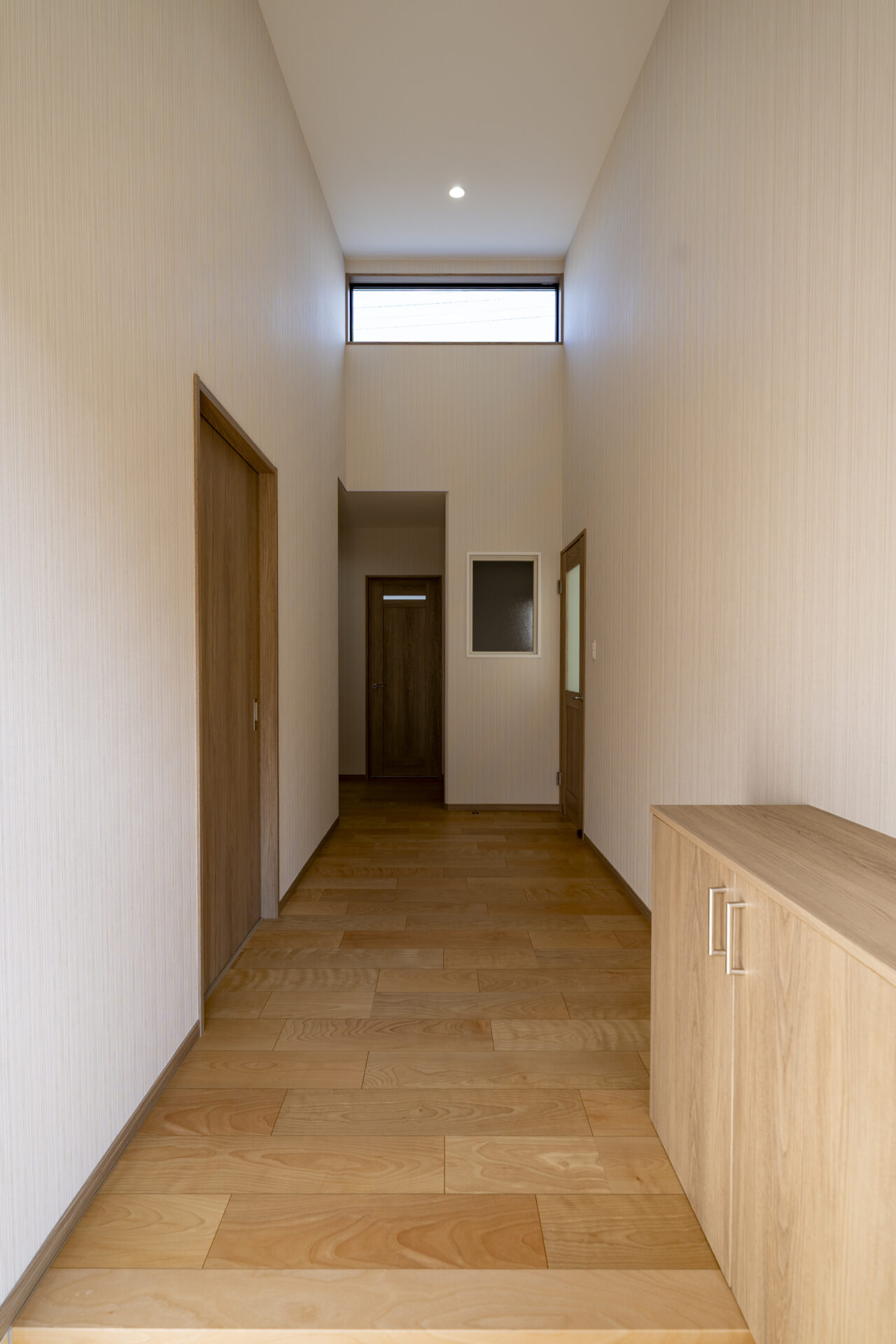 玄関ポーチには車椅子でも無理なく利用できるスロープを設け、バリアフリーに配慮したアプローチとしています。吹き抜けとFIX窓を組み合わせた玄関ホールは、自然光を取り込みながら明るく開放的な大空間を形成。