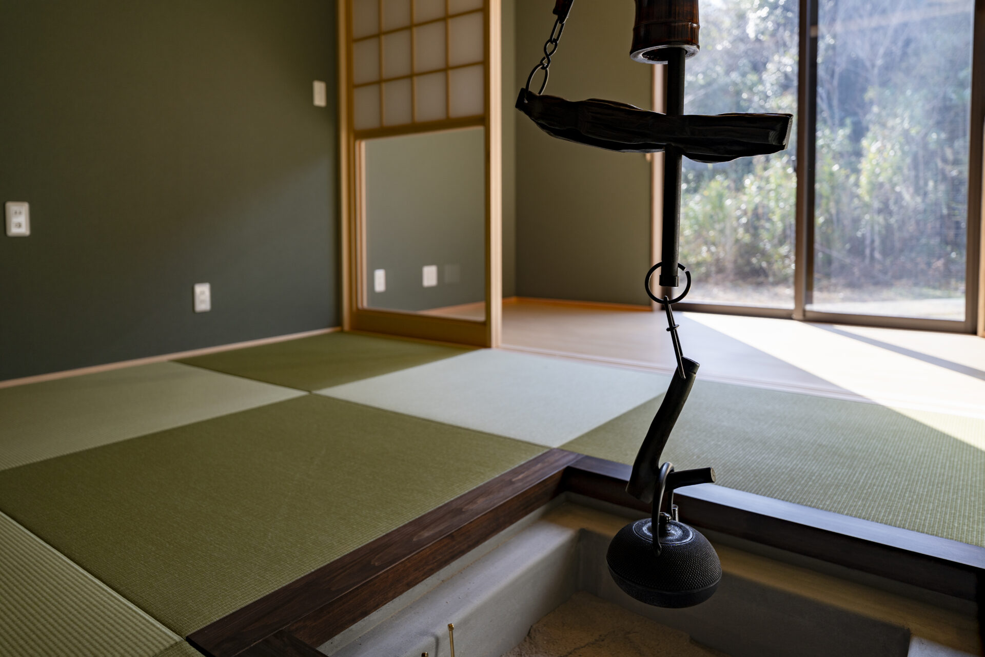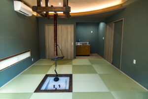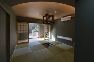 事務スペースには掃き出し窓を採用し、オフィスでは珍しい外部との連続性と、日中の安定した採光を確保しました。和室は囲炉裏としての利用も想定し、R形状の折り上げ天井と間接照明によって、旅館のような落ち着きと安らぎを演出。縁側には竹垣と庭を設け、視線の抜けとともに穏やかな外部環境を取り込んでいます。