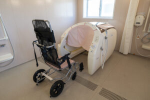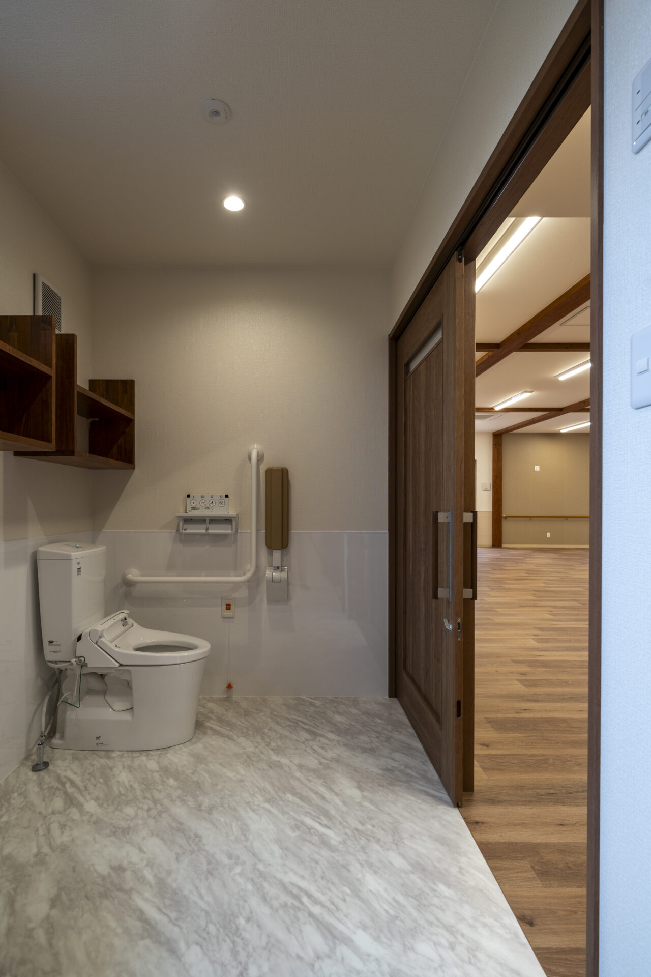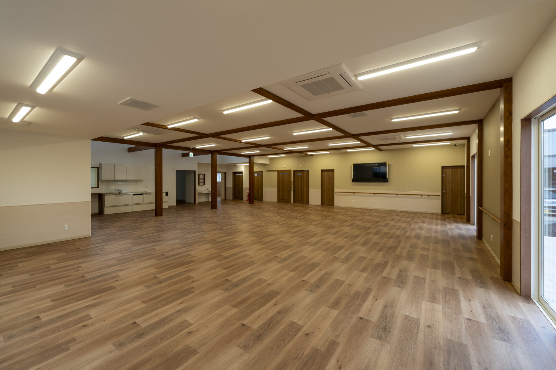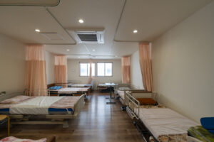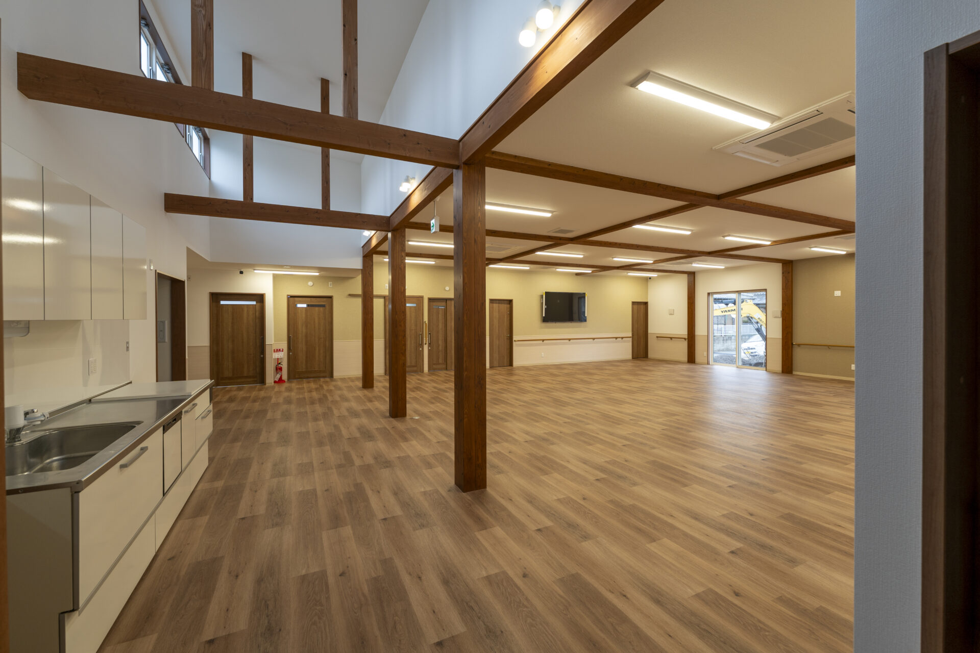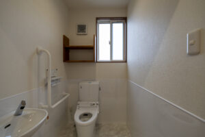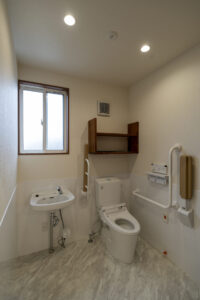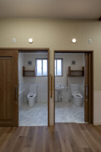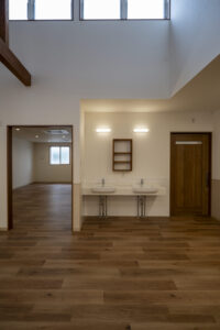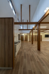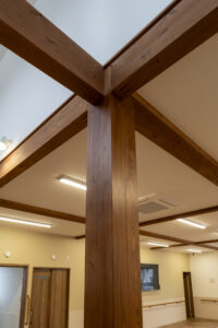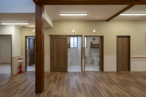 木造トラス構造と組立柱を採用し、約10m角のスパンを柱のない大空間として実現したデイサービスセンター。従来は軽量鉄骨造が主流となる規模の施設をあえて木造で計画することで、コストを抑えながら工期の大幅な圧縮にも成功しました。吹抜けに設けた窓からは、柔らかな自然光が差し込み、開放感と明るさを確保。座ったまま入浴できる介助浴槽をゆとりをもって配置したオリジナルの浴室計画や、利用中かどうかを遠目から一目で確認できるトイレ照明の工夫など、利用者と職員双方の負担を軽減する細やかな設計配慮を重ねました。木の質感を活かした内装は温もりを感じさせ、地域に開かれた安心の拠点となる施設を目指しました。