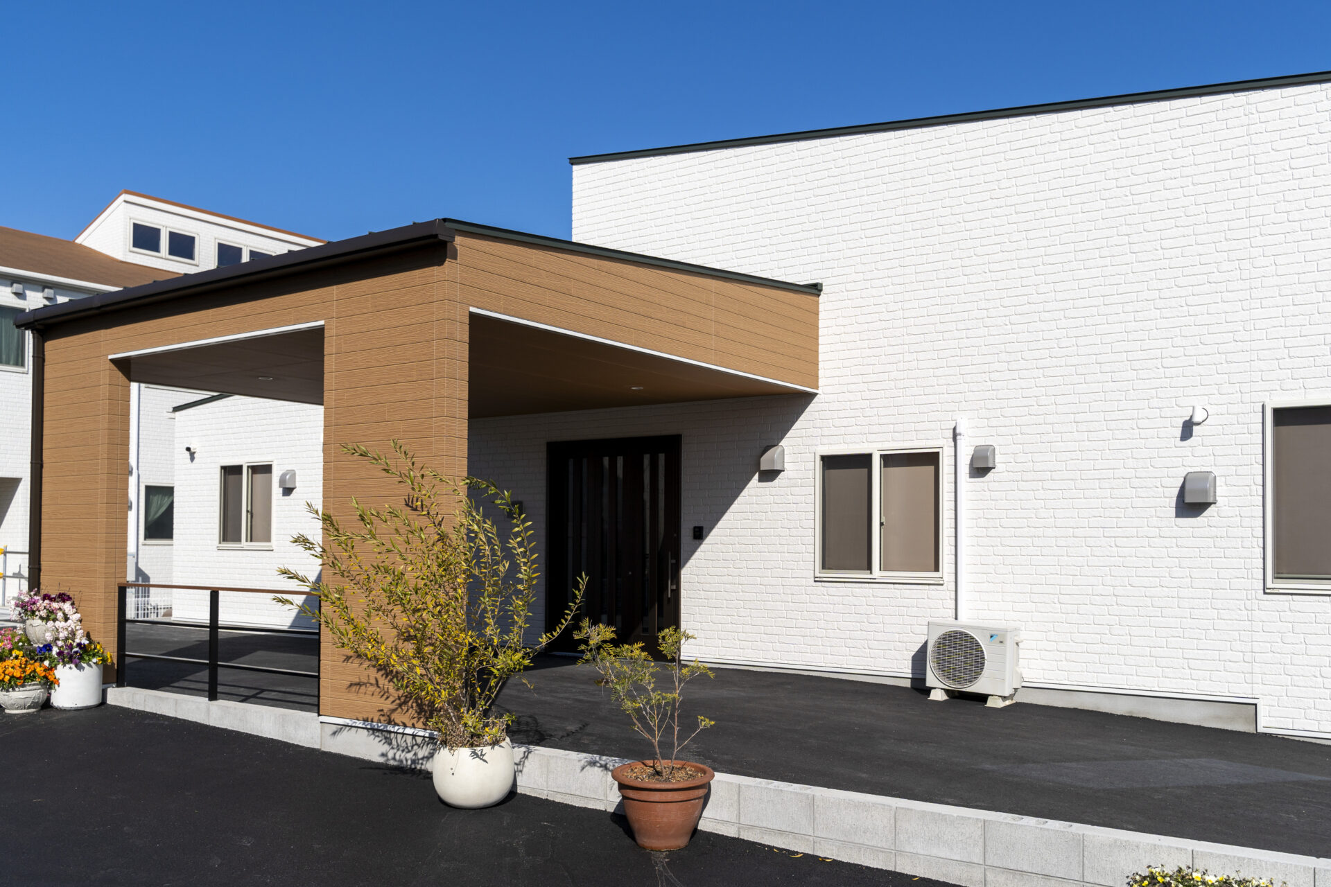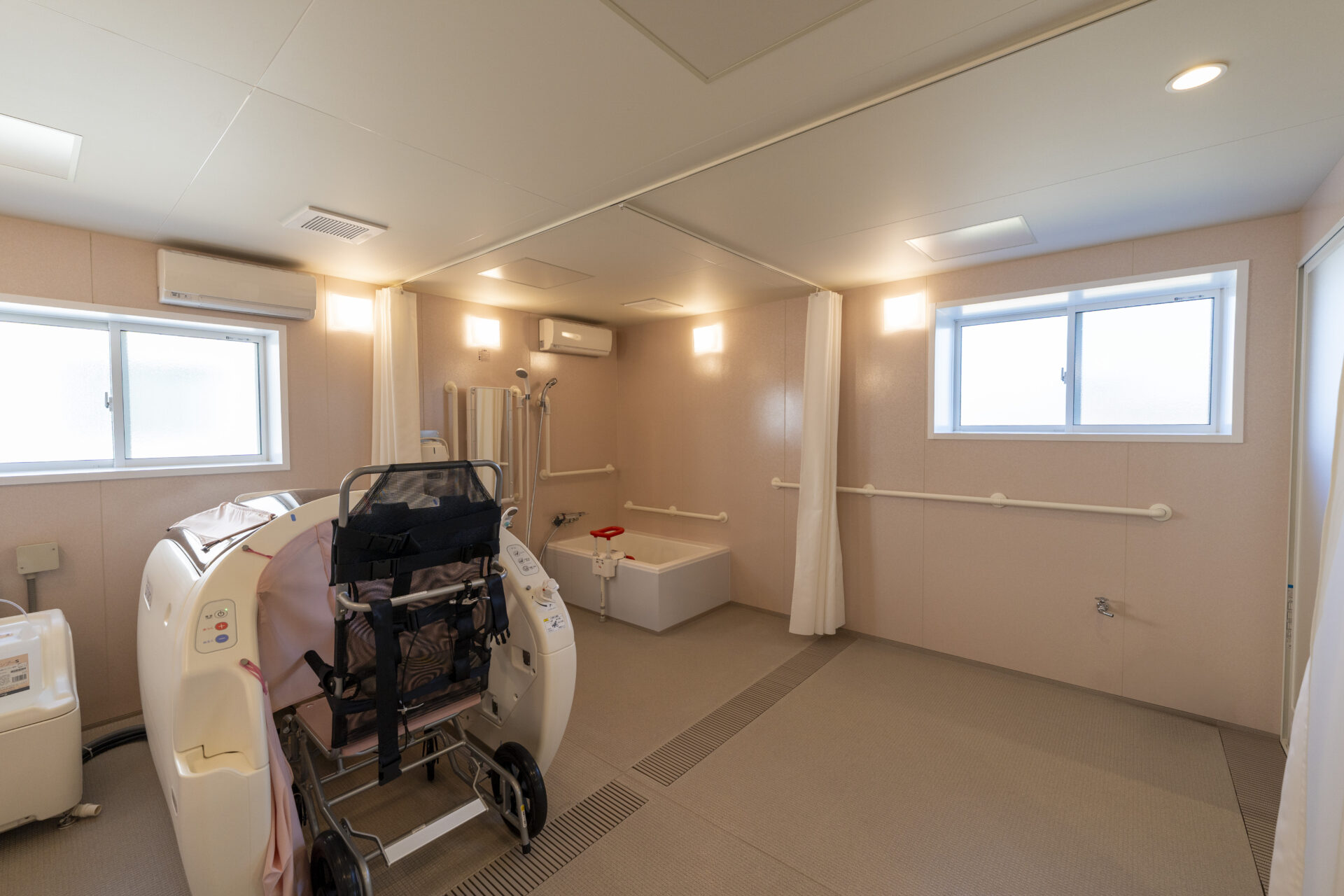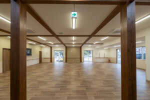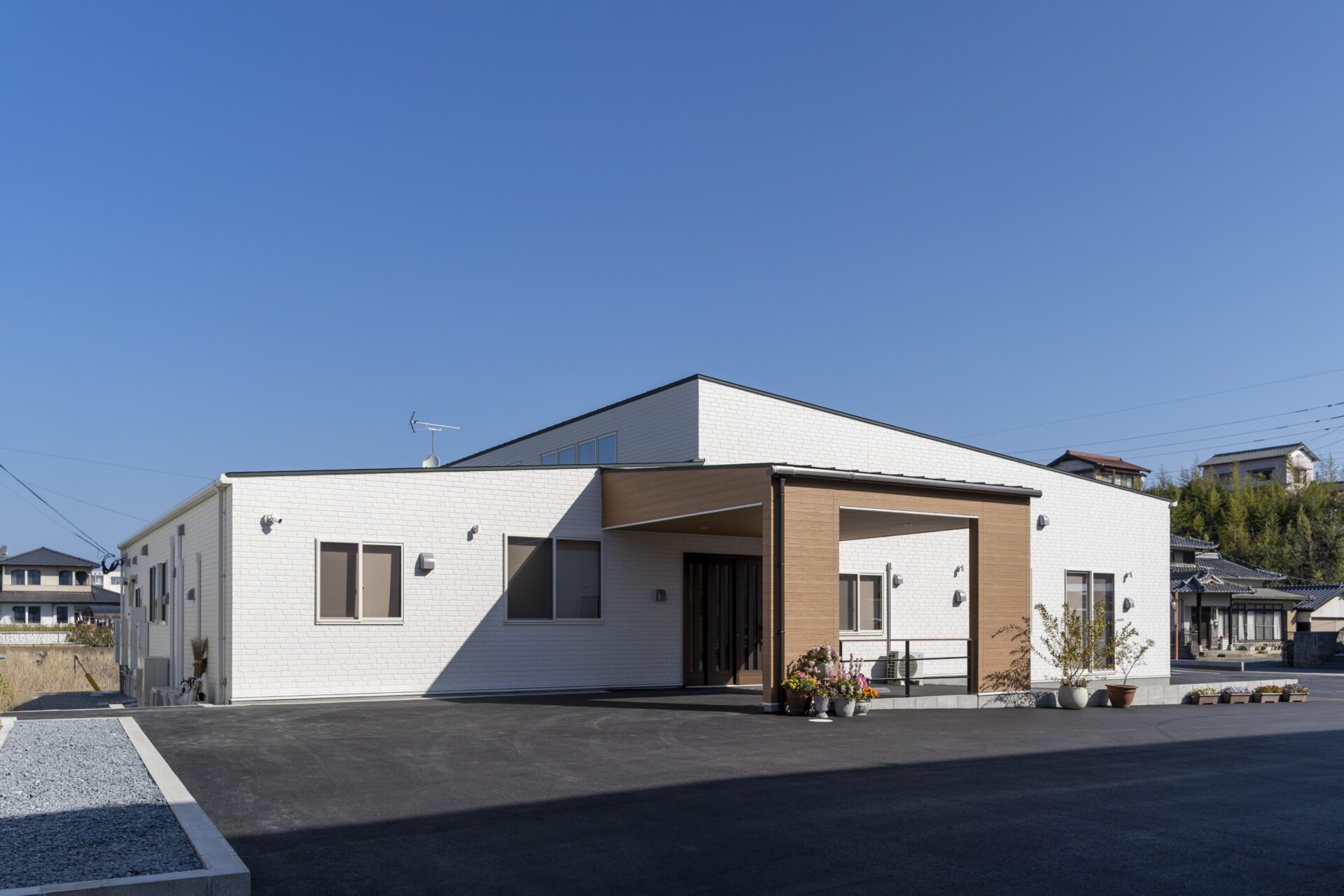 木造トラス構造と組立柱を採用し、約10m角のスパンを柱のない大空間として実現したデイサービスセンター。従来は軽量鉄骨造が主流となる規模の施設をあえて木造で計画することで、コストを抑えながら工期の大幅な圧縮にも成功しました。吹抜けに設けた窓からは、柔らかな自然光が差し込み、開放感と明るさを確保。座ったまま入浴できる介助浴槽をゆとりをもって配置したオリジナルの浴室計画や、利用中かどうかを遠目から一目で確認できるトイレ照明の工夫など、利用者と職員双方の負担を軽減する細やかな設計配慮を重ねました。木の質感を活かした内装は温もりを感じさせ、地域に開かれた安心の拠点となる施設を目指しました。