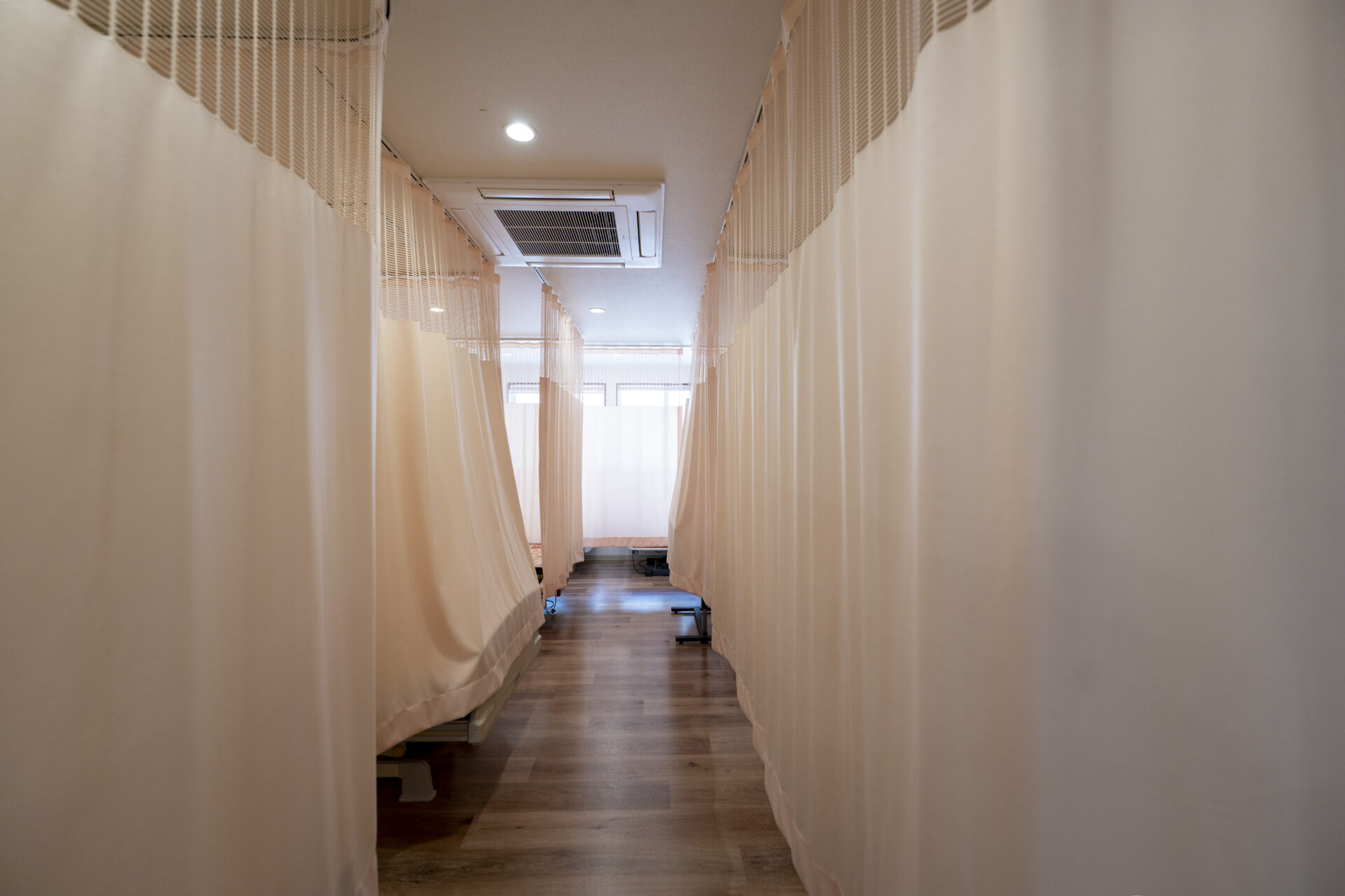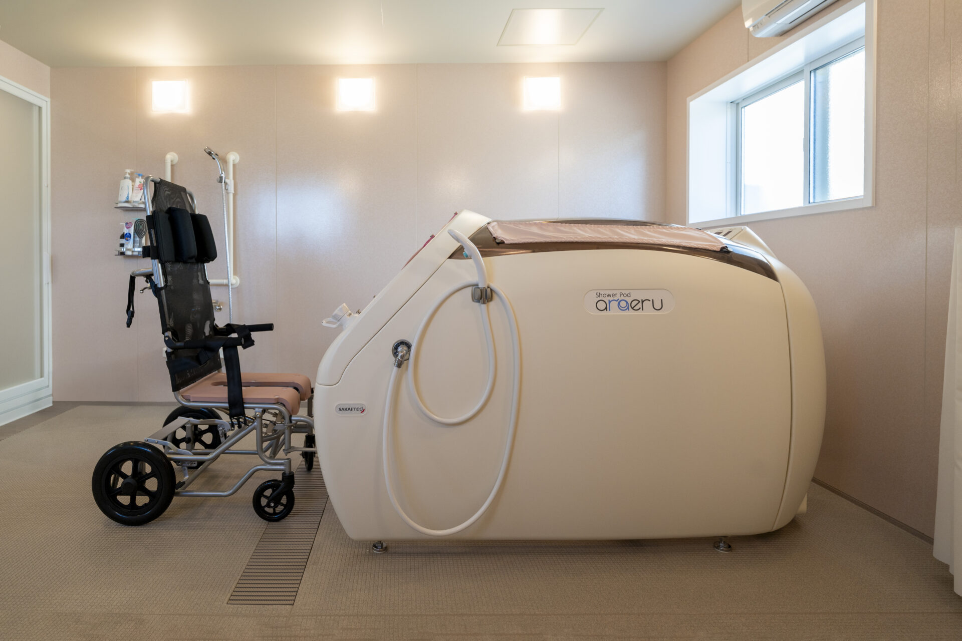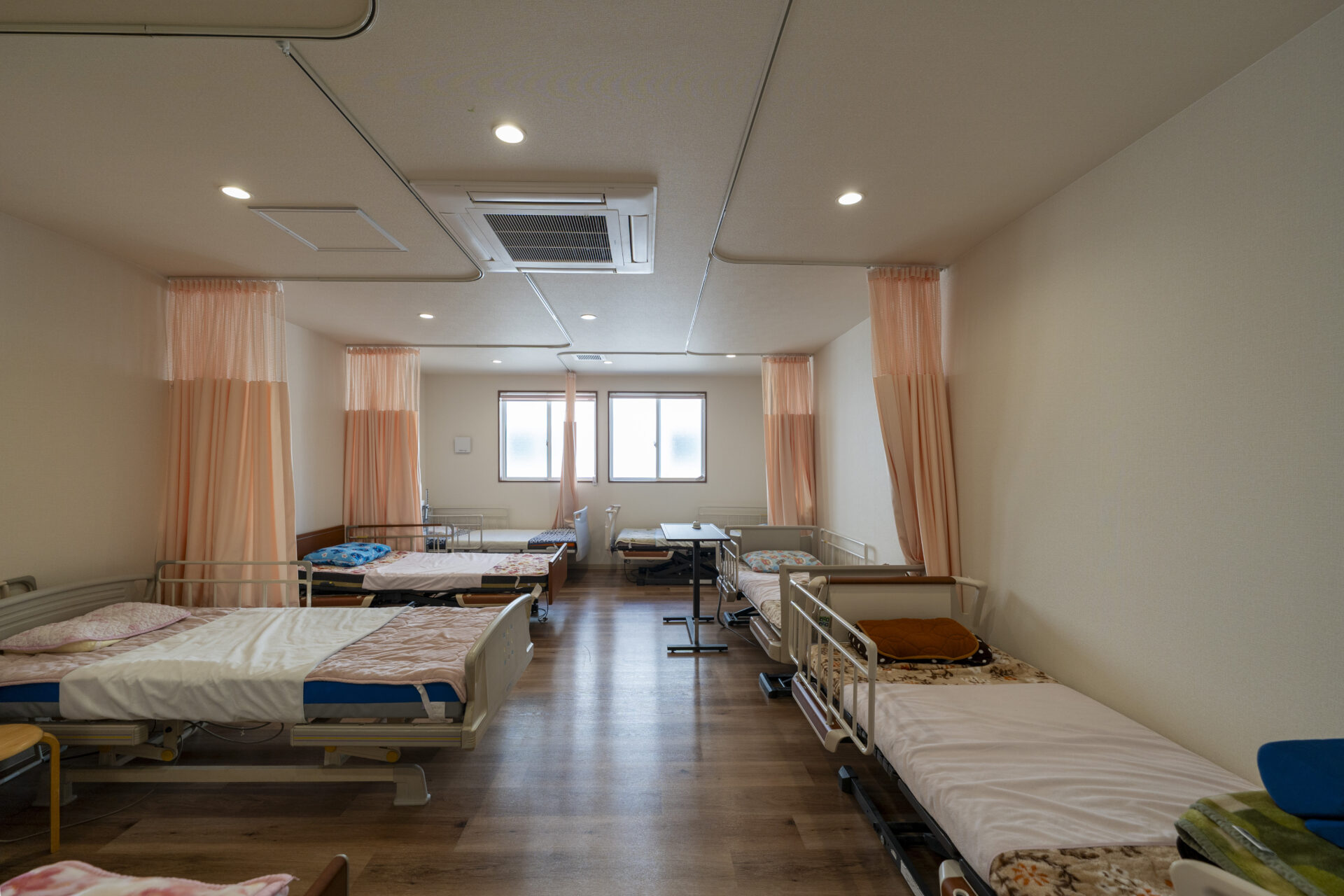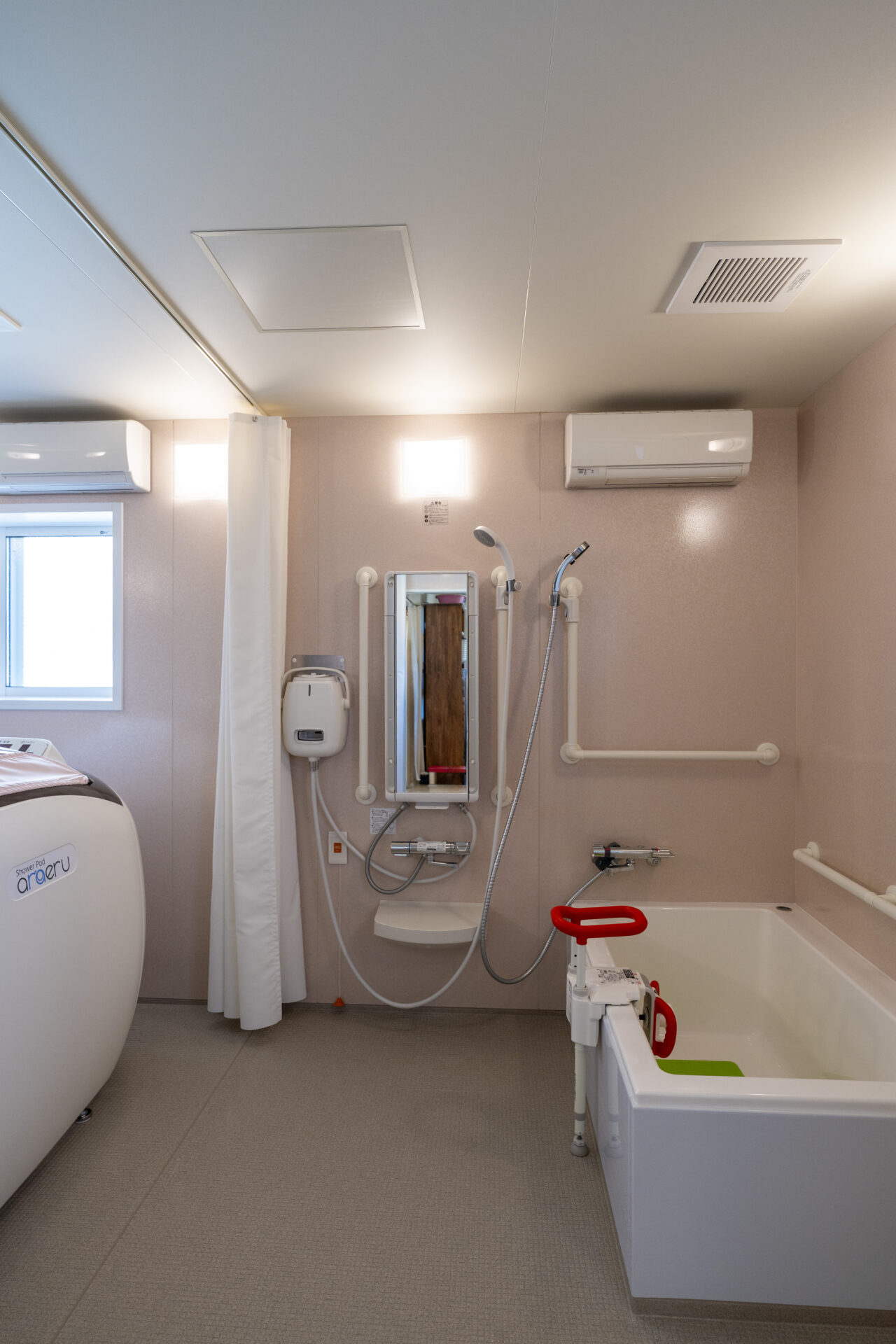 木造トラス構造と組立柱を採用し、約10m角のスパンを柱のない大空間として実現したデイサービスセンター。従来は軽量鉄骨造が主流となる規模の施設をあえて木造で計画することで、コストを抑えながら工期の大幅な圧縮にも成功しました。吹抜けに設けた窓からは、柔らかな自然光が差し込み、開放感と明るさを確保。座ったまま入浴できる介助浴槽をゆとりをもって配置したオリジナルの浴室計画や、利用中かどうかを遠目から一目で確認できるトイレ照明の工夫など、利用者と職員双方の負担を軽減する細やかな設計配慮を重ねました。木の質感を活かした内装は温もりを感じさせ、地域に開かれた安心の拠点となる施設を目指しました。